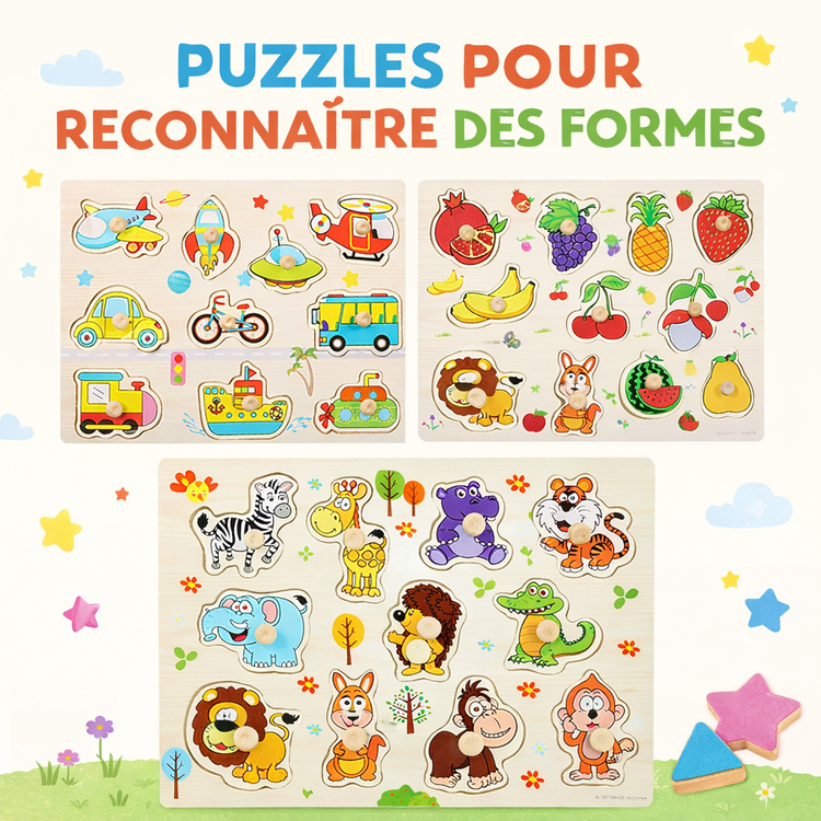 À travers des puzzles pour reconnaître des formes, l’enfant découvre progressivement des univers familiers et stimulants : animaux de la savane, animaux du zoo, fruits, véhicules, alphabet et formes simples. Chaque puzzle enfant devient un support de reconnaissance visuelle, favorisant l’observation, la mémorisation et l’association.